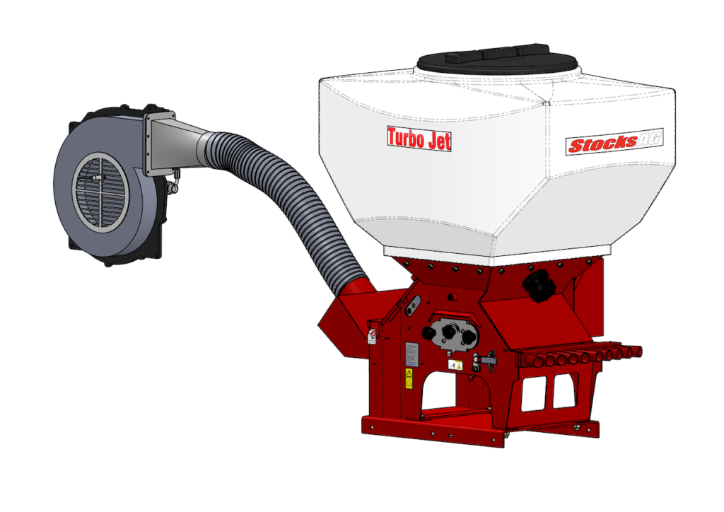 Renowned for airflow and output and built with industry-leading high-capacity electric fans, the current range of Stocks Turbo Jet’s excel at applying product at up to 10m. However, the appetite to work at wider working widths across the UK and Europe continues, be that with rolls, drills, cultivators, comb harrows etc. This has led Stocks to develop an applicator with even more air flow to apply small to medium sized seeds such as oilseed rape, clover, grass, mustard, etc… at high rates from 10m as well as micro and granular products at low to medium rates, all at up to 15m.