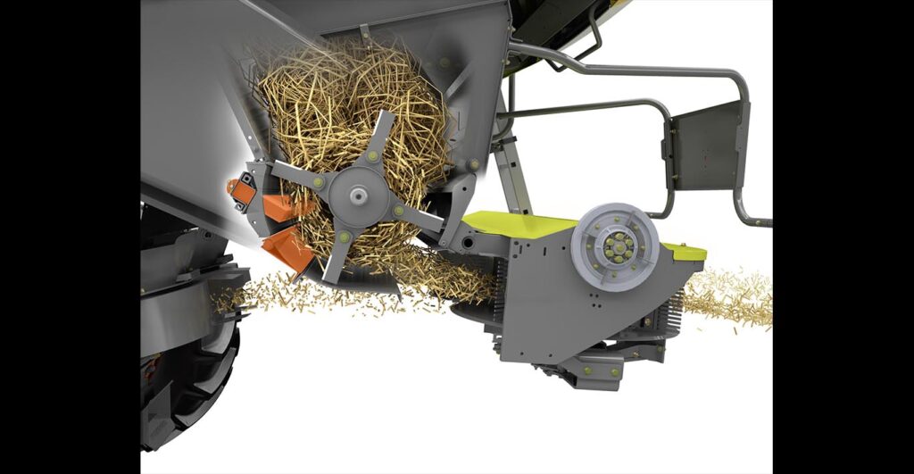 The all-new threshing unit features a 450 mm pre-accelerator drum, a 755 mm threshing drum with ten rasp bars and an additional separator drum with a diameter of 600 mm ahead of the impeller.